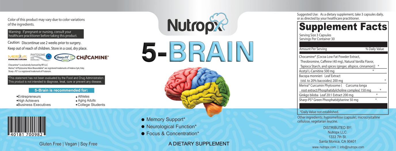 Introducing 5-Brain™ by Nutropx™ LLC—a premium nootropic blend designed not just to enhance your cognitive functions but to safeguard your brain against the threats of cognitive decline, stress-induced damage, and the fog of everyday fatigue.